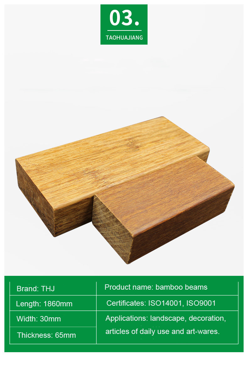 THJ outdoor bamboo beam is a carbonized, anti-corrosive bamboo boards made from bamboo fibers with unique, patended heat treatment process ensures THJ bamboo beam to be compliant with the EU standards and a prefect durability. THJ bamboo beam with excellent physical properties, such as high stability, high density and hardness etc to create it more prefect for exterior applications. In addition, The product has also passed the fire resistance test and it can acheive the fire resistance Class B1(EN13823 and ENISO11925-2). Strand woven bamboo beams can be made into a variety of dimensions, which widely used in outdoor furniture, handicrafts and other fields instead of wood and steel.