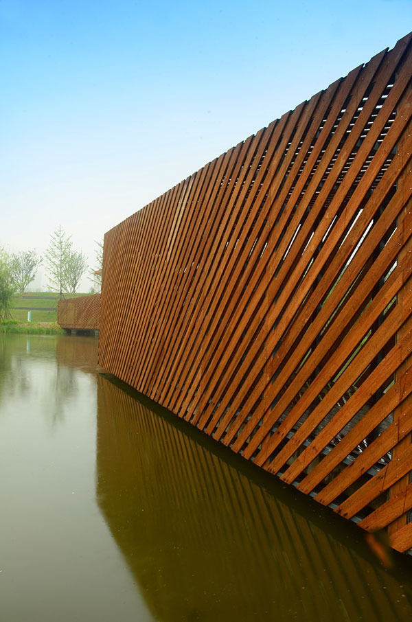 The bamboo landscape bridge is located in Zhenghong Central Park, Zhengzhou city, China. The main structure is steel frame. The outdoor high carbonized anti-corrosion bamboo flooring and shallow carbonized grilles from TaoHuaJiang are used to shape and decorate the bridge. The design of the landscape bridge is concise and simple. The strong outline of the straight and diagonal lines and the expression of the outdoor bamboo material with great affinity make the landscape bridge have a very Northern European style and become the core of the park landscape.
